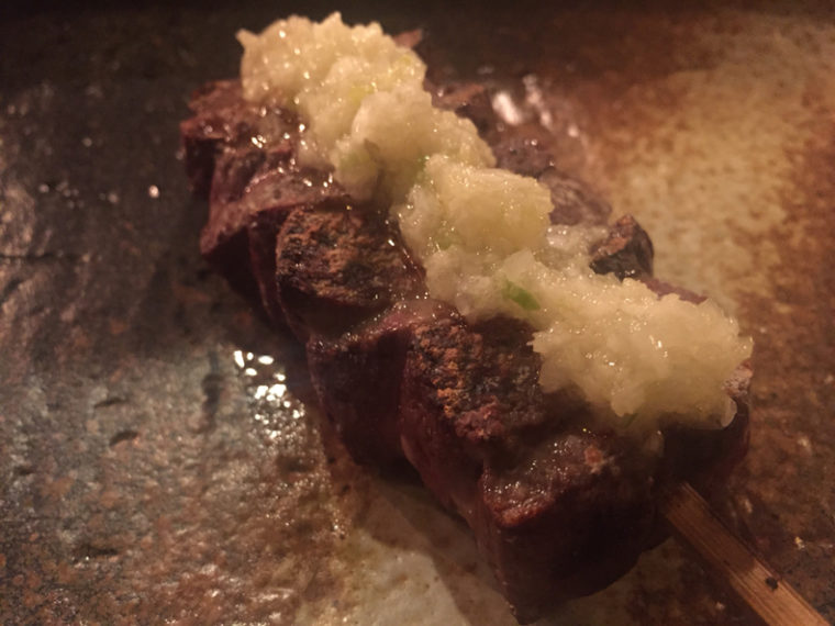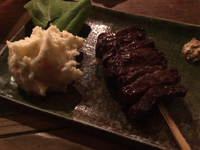 2015.04.13 夜 牛ハラミの串&牛ナンコツのカレーが絶品すぎる!@日南 居酒屋・定食 目黒・白金・五反田 5000円〜9999円 ★★★★★ 夜の五反田。近くのスタジオで仕事を片付け、夜飯の物色を開始。終了時間が読めない仕事の時は事前予約ができないので苦労します。しかも今日は金曜日。周辺の行ってみたいお店に片っ端から電話をかけます。 まず1件目。お二人ならOKですの回答。ちょっと拍子抜けしましたが、それがここ『日南』です。 店は少しわかりづらい。五反田らしい少し怪しい通りをキョロキョロしていると必ず客引きのお兄さんにつかまります。無視をきめ込みましたが、結局教えていただきました。お兄さん、ありがとうございます。寒い中ご苦労様です。 わかりづらいわけです。街頭があまりなく、地面には薄汚れた人工芝。お店はかなりの古さとディープな一角にありますから。 空いていたのは奇跡に近い。本当に2席のみ空いております。狭いカウンターに隙間なく席があり、テーブル席も満席なら、階段上の2階席まで満席だそうです。 店の古さと対照的に細かいポイントが洒落ている。例えば、店員さんの服。首元の小さいネクタイが共有の制服のようだ。 お通しのむかごのぬか漬けをつまみながら、さっそく注文させていただきます。 ■馬モツ煮込みトマトソースで煮込み、チーズとタバスコが合う。この味付けに馬肉の触感というのが新しい。確実に初めての食べものといえます。 ■牛ハラミ串焼きこれは絶品!!注文が必須のアイテムです。一人一本なのがもどかしい。周りはしっかり焼き、中はほんのりピンク色。適度な食感があり、口の中でずっと脂を放出します。溶けるな肉!と唱えそうになります。しかも、ポテトサラダときたもんだ。 ■牛レバ串焼きたっぷりのニンニクの香がそそります。焼き加減が香ばしさを提供してくれ、これも美味。 ■牛軟骨ハンバーグ馬肉も同様でしたが、洋のエッセンスを追加したメニューが存在。これもそのひとつ。深みのあるデミグラスソースでこれだけでも通じる。軟骨の食感もアクセントになって面白い。 ■卵かけ御飯八ヶ岳卵というらしいですが、標高1050mで育った希少価値のある卵だそうです。黄色が黄色じゃない。濃厚さと旨味がビジュアルから伝わります。天日干しというお米との相性も抜群で、鰹節と一気にいただきます。 ■牛ナンコツカレー欧風カレーな印象。味の深みは牛肉から贅沢なほどにじみ出ております。仕込みに2日間かけたカレーは、野菜の甘みと肉の深みで無敵なカレーに仕上がる。これも絶対注文してほしい。 ―日南03-3449-4425東京都品川区東五反田1-13-6https://tabelog.com/tokyo/A1316/A131603/13001650/