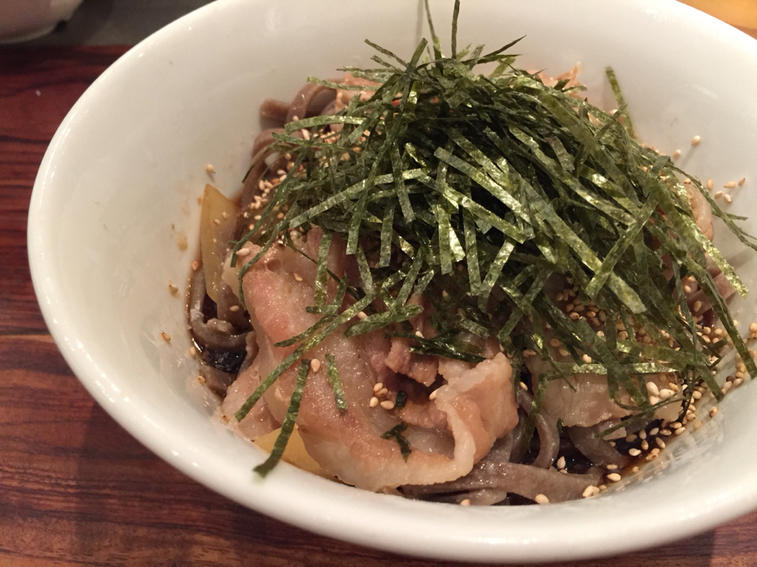 2015.10.12 夜 味噌醤油屋がお蕎麦を作ったらどうなるか。@酢重正之 楽 そば 東京・日本橋 〜999円 ★★☆☆☆ 前身の酢重丸五商店から数えると200年近い歴史を持つ。1827年の創業で味噌蔵として信州で産声をあげる。いまでも酢重正之商店は軽井沢に味噌醤油屋として根付いている。この日本の伝統食材である味噌や醤油を使った店舗展開のひとつが、『酢重正之 楽』である。 一品料理なんかも味噌や醤油を活かしたメニューが並ぶ。原材料を作ってる強みは確実にあります。人気の鉄板焼きの銀座『コルザ』なんかもキッコーマンの直営店ですしね。 「肉そば(冷)」(930円)極太のそばに大量の海苔と白胡麻。見た目はそう、『港屋』のそれ。 食感も固さがMAX。食感の点は好みかもしれないが、これほどの食感が必要なのかと考えてしまう。盛りそばだったら食えなかったなぁ。大量の肉達に救われました。つゆの風味はなかなかいい。特段特徴があるわけではないが醤油や出汁には確かな腕があるでしょう。 もう少し辛味がほしいのが正直な感想。食後に気づいたが、辛みそが卓上にあるのでこれで好みに調整できるようだ。 ―酢重正之 楽03-5218-5050東京都千代田区丸の内1-5-1 新丸の内ビルディング B1Fhttps://tabelog.com/tokyo/A1302/A130201/13078576/