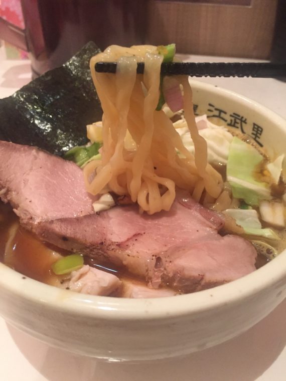 2016.01.08 夜 これは美味しい!「江武里」の「エブリー」ラーメンに挑戦したい!@江武里 ラーメン・つけめん 上野・浅草・日暮里 〜999円 ★★★★☆ 『江武里』最初の印象は「every」の当て字か?という店名への興味。ふと横浜にある焼き鳥の『里葉亭』(リバティー)を思い出しました。キラキラネームのような今風(?)なネーミングですが、店内には北斎や写楽の絵が飾られる。また、浅草という土地を選択していることからチャラい感じではないようだ。 「浅草カリー麺」限定品のようだが、10月~5月までともはやレギュラーメニュー。並・中、大と同じ値段なのだが、なぜか中を選択。もったいないとダイエットの狭間で無意識に選んだのだろう。 まずは、スープを一口。10種類以上のスパイスを配合していてカレーの味が当然目立つ。ただ、白湯スープと魚介出汁が深みを作り、ただのカレースープとは一線を画す。この一体感は素晴らしい。 豚と鶏のチャーシューは1センチ幅の厚み。鶏のパサツキはカレーがカバーし、豚肉にはデミグラスソースのような味付けが美味。その他、江戸菜のチョイスが面白い。シャキシャキの食感でアクセントになっている。 麺はもちもちの平打ち。通常好きなタイプではないが、カレーのスパイスにたいして存在感を担保できている。後半やってきた辛味とよく絡みます。 最初から限定メニューを頼んでしまったことは珍しい。次回は通常のメニューにもチャレンジしたい。いや、エブリーラーメンに挑戦したい。お気に入りになりました。 — 江武里東京都台東区雷門2-4-1 岡安ビル 1Fhttps://tabelog.com/tokyo/A1311/A131102/13167936/