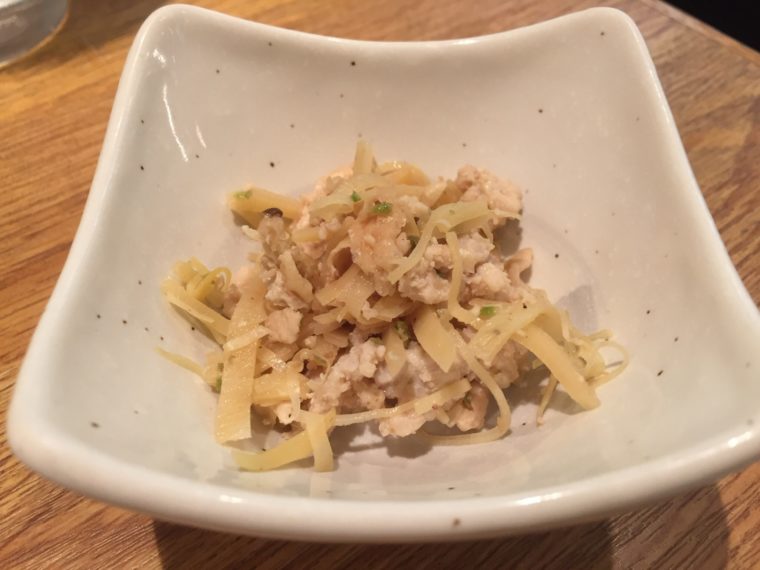 まずはお通し。「鶏皮と筍の山椒炒め煮」山椒のピリ感が胃にビールを流し込むお手伝いをしてくれます。