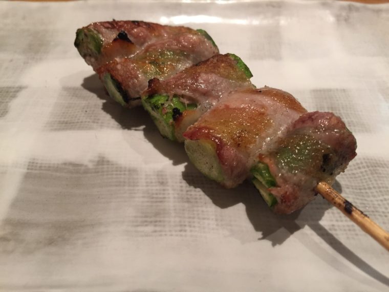 「アスパラ巻」バラ肉をしっかり巻きつけ、アスパラが肉汁をきっちり受け止める。