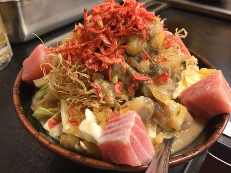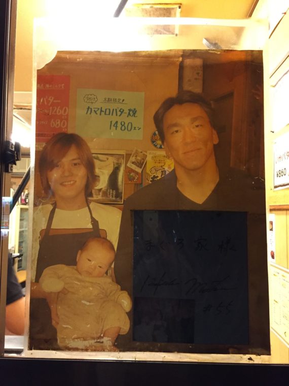 2016.05.04 夜 まぐろ家で食べる「まぐろ」のもんじゃ!@もんじゃ まぐろ家本店 お好み焼き・もんじゃ焼き・鉄板焼き 築地・湾岸・お台場 3000円〜4999円 ★★☆☆☆ 月島のもんじゃストリート。もはや観光地化しているほど活況だが、各店舗の特徴を語るのは至難の業だ。鉄板焼きでもんじゃを自ら作ることは共通で、芸能人のサインや写真はほぼ皆勤賞状態だ。その中で簡単にブランディングできた店は『もんじゃ まぐろ家』名前を見ての通りで、もんじゃより「まぐろ」が強調される。もんじゃを食べるのにまぐろが必要かどうかは置いといて、ひとまず何が特徴かは伝えている。 もちろんメニューには「まぐろ」が並ぶ。数量限定の「本マグロのカマトロ」。 昔はゴミとして捨てていたものですが、日本人のMOTTAINAI精神が食卓に連れてきたのでしょう。脂が多い部位なので好みも分かれるところですが、もんじゃ屋のそれとしては満足感あり。 もちろん、もんじゃにも「まぐろ」のメニューがある。 いただいたのは「まぐろあさり」。築地で仕入れた食材のもんじゃです。味付けはだいぶ濃い目です。特製秘伝の出汁を使用しているそう。 そのせいか、まぐろやあさりの存在感は少々薄め。これはこれでMOTTAINAI! 定番の「もち明太子チーズ」や変り種の「ベビースターカレー」にも挑戦。共通するのはやはりしっかりした出汁の味付け。 月島の芸能人の写真は珍しいものではないが、入り口の元巨人(ヤンキース)の松井選手にはちょっとミーハー心が出ちゃいました。 やはりミトミえもんも男の子なんですね。 — もんじゃ まぐろ家 本店050-5869-9012東京都中央区月島3-7-4https://tabelog.com/tokyo/A1313/A131302/13007576/