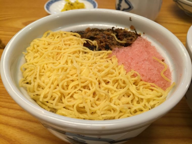 酢飯の上に焼き穴子、錦糸卵、海老おぼろの具材をきれいに盛り付けております。カラフルな見た目は女性的な演出なのでしょうか。