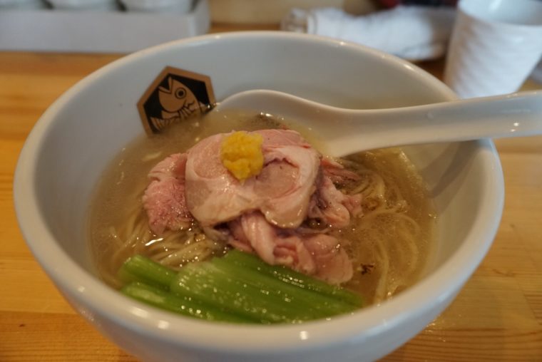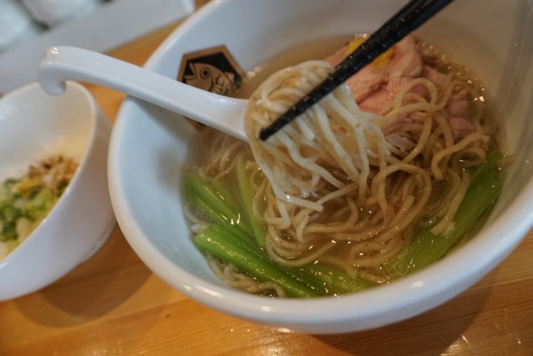2016.09.27 昼 美味しい鯛ラーメン、ありがたいありがたい。@真鯛らーめん 麺魚 ラーメン・つけめん 両国・錦糸町・小岩 1000円〜2999円 ★★★★★ 錦糸町。そこまで土地勘があるわけではない。だが錦糸町にある人気らーめん店の『麺魚』の場所は悩むことはない。長い行列と壁に大きく描かれた鯛の絵が目印だ。 平日の開店15分前。すでに20人超が店の目の前の公園に列を作る。待っている約1時間、拷問のように鯛の出汁の香りが鼻に届きます。笑 メニューはもちろん鯛一色。自慢の「真鯛ラーメン」をいただいてみましょう。 むむむ、丼の真ん中で最も大きい存在感を発揮するのは真空低温調理チャーシュー。桜チップでじっくり燻製しているそうで香りが立ちます。上には柚子、横には小松菜というシルエットだ。 鯛はどこにいった?安心してください。もちろん出汁は鯛がベース、さらには鯛から抽出した油を香味油として使用。具材にも炙った鯛のほぐし身が使われ、燻製された味玉作りにも鯛を活用しているのだとか。真鯛ラーメンの名にふさわしいラーメンだ。 見た目には清湯スープなのに、反比例するかのように鯛の濃厚な出汁を感じます。チャーシューや玉子だけでなく、鯛のほぐし身の薫香も出汁にポジティブな影響を与えます。バランスをとるかのように柚子が爽やかさを追加してくれます。 素晴らしいスープのなかで泳ぐのは石臼挽き全粒粉のストレート麺。北海道産小麦100%という麺の風味は存在感の強いスープにも負けません。喉越しもよさもよく、全体的に完成度の高い丼に仕上がる。 しかも、ここで終わりではない。絶品スープには白飯を投入しましょう。 あっという間に鯛出汁のお茶漬けの完成。ラーメンのスープということを忘れてしまいます。久しぶりにスープまで完飲してしまいました。 こんなに美味しいものをいただけるなんて、本当にありがたいありがたい。 — 真鯛らーめん 麺魚東京都墨田区江東橋2-5-3 井上ビル 1Fhttps://tabelog.com/tokyo/A1312/A131201/13190945/