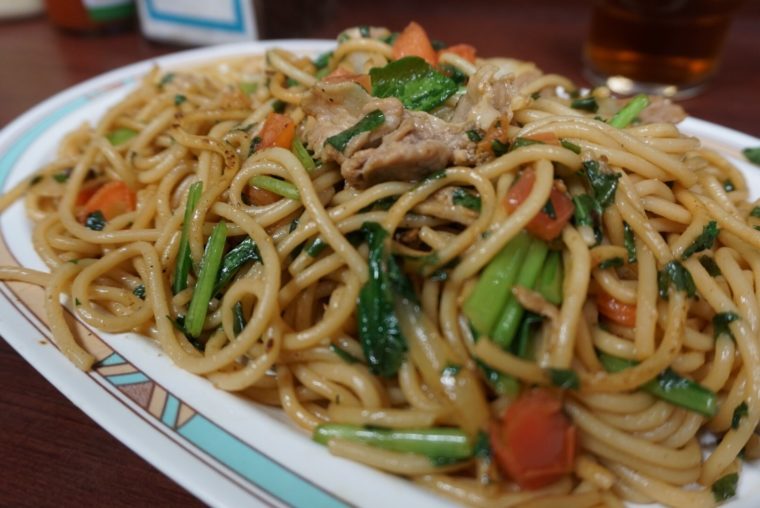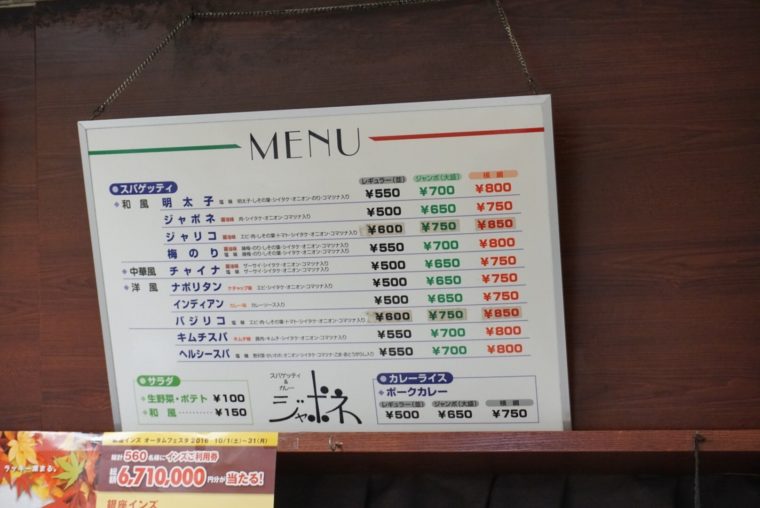 ロメスパとは路麺のスパゲッティ。茹で置き、極太、デカ盛りがデフォルト。和風、中華風、洋風とあるが、店の名前も持つジャポネが人気。醤油味の和風で肉、シイタケ、オニオン、小松菜が入る。さらにアップグレード版となる「ジャリコ」にはエビと紫蘇の葉、トマトが加わります。
