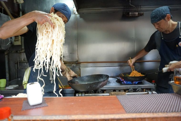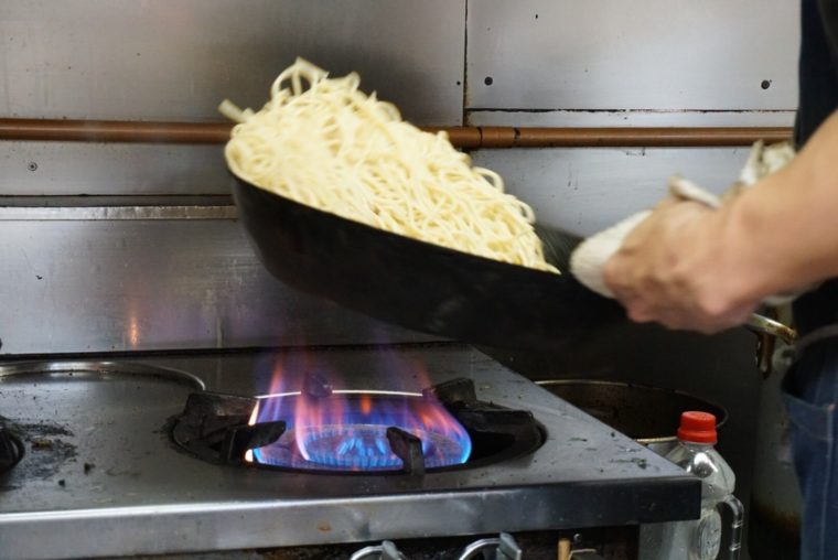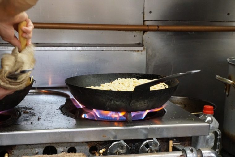 ということで、「ジャリコ」大盛り!!茹で置きの大量のスパゲッティを強火で熱し続ける鍋に大胆に投入。重そうな鍋ですね。こびりつくほど焦げ付けるのが重要なアクセントを担う。
