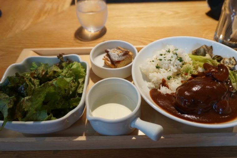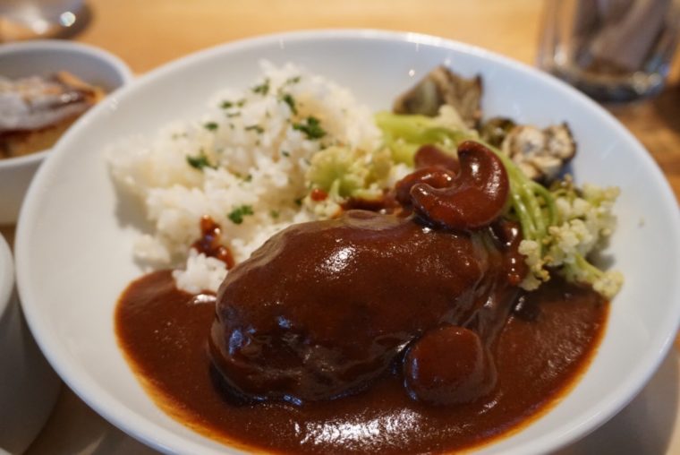 だが全体的にはバランスのとれたプレートでカロリーも控えめな印象。マッシュルームなども加えたデミグラスソースもしつこくなく優しい味付けです。