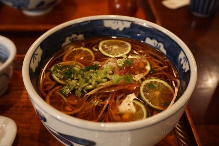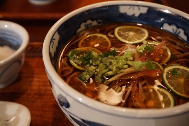2016.11.13 昼 夏じゃなくても食べたい京金の「すだち蕎麦」@京金 そば 両国・錦糸町・小岩 1000円〜2999円 ★★★★★ 夏の風物詩になりつつある「すだち蕎麦」。酸味やひんやりした爽やかさは夏の暑さにぴったりです。最近はレモンをいれる店なんかも出てきてますね。 さて、本日訪ねたのは創業が江戸時代(1831年)という老舗の蕎麦屋『京金』。すだち蕎麦が名物として有名であり、これが季節を問わず食べたいほど美味しい。寒くなってきた今日この頃ですが、迷わずすだち蕎麦を発注します。 すだちは適度に散らした程度で器いっぱいという印象ではない。これが功を奏すのか酸味は適度で風味豊かな出汁の香りと味に見事にマッチする。実は酸味の強い食べ物って少し苦手なのですが、その心配が一切ない。むしろ旨味を1つ上にひきあげる印象だ。薬味の茗荷と三つ葉がさらに清涼感を作り、アクセントとして十分に役割を果たす。 鰹出汁の風味とすだちの適度な酸味の貢献を一身に受ける蕎麦。打ち始めの新そばで昔ながらの手法で手打ちしているそうです。さすが老舗。相性がばっちりであっという間に完食してしまいます。 やっぱり寒いですからね。温かい蕎麦もいただいてみましょう。 「鴨南蛮」は出汁の旨さは共通。そんなに特徴はないと思いきや山椒をいれると印象が一変。山椒の香りが出汁、蕎麦、鴨すべて好影響を与えます。 出汁の旨さをもっと味わいたいという方はずばり「出汁巻き玉子」を。出汁がしっかり染込んでいますが優しい仕上がり。ふわふわな食感もたまりません。是非蕎麦のお供にどうぞ! — 京金東京都江東区森下2-18-2 1Fhttps://tabelog.com/tokyo/A1312/A131201/13002990/
