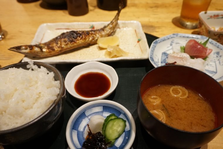 これは悩みますね〜。1つだけ悩まないのは「欲ばり定食」を頼むことだけ。焼き魚に加えて刺身がついてくる文字通り贅沢な定食です。