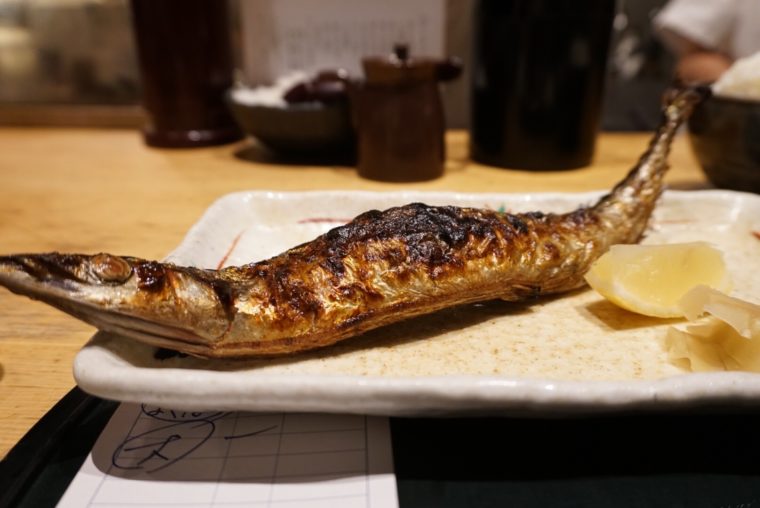 焼き魚はきっちり炭で焼き、煙とともにやってくる香りが空腹感を助長させます。注文した秋刀魚は鉄串に刺し、一本一本丁寧に焼き上げます。
