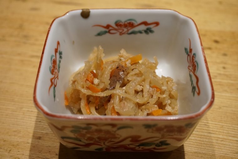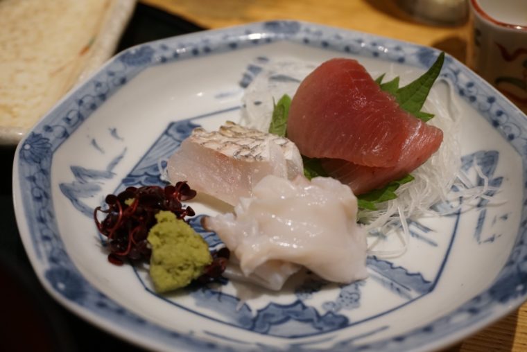 定食を贅沢にしてくれたメジマグロ、鯛、タコの三種に切り干し大根。さらに、山椒のふりかけなんかもあってご飯のお供には事欠かさないですね。