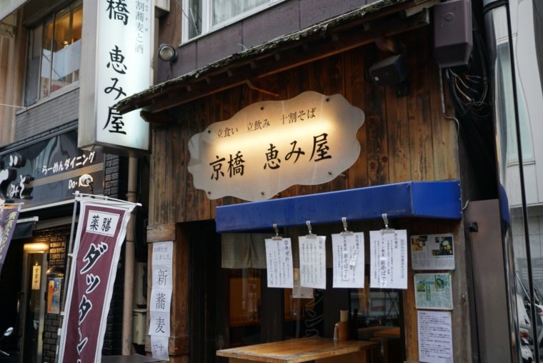 2016.11.26 昼 どうか私に美味しいお蕎麦をお恵みください!魔法のネギ汁も必食!@恵み屋 そば 銀座・新橋・有楽町 〜999円 ★★★★☆ 立ち食い蕎麦と侮るなかれ。ここ『恵み屋』はいわゆる立ち食い蕎麦ではない。美味しい蕎麦をつまみに焼酎を飲む。忙しない立ち食い蕎麦ではなく、ゆっくりできる大人の社交場だ。 ロック好きにはなお居心地がいいだろう。店にはロックな音楽がアンプから流れ、壁には洋楽のCDが並んでいる。 そんな雰囲気もさることながら、何より魅力的なのは美味しい蕎麦を安く食べれることだ。なんとワンコインの提供してもらえるのは十割蕎麦。しかも毎日石臼で挽いた蕎麦ときたもんだ。天ぷらはおろか、かけそばすらないことがスリム化できた理由なのでしょう。 ダッタン、更科、田舎など同じ10割でも種類があるが、基本となる「恵み蕎麦」を紹介してみましょう。十割らしい風味を感じる細麺で辛口の汁をちょろっとつけていただきましょう。 だが、本当におススメしたいのは、この汁に自家製のネギ油を混ぜた「ネギ汁」だ。これ美味しすぎます。ちょっと反則なくらい。香ばしさやコクをスープが受け取り、つけ汁としては最高にずるい味になります。笑 ちなみにこのネギ油はお持ち帰りの注文が可能。皆さんの予想に違わず、ミトミえもんはこの絶品のネギ油も恵んでいただきました。ありがたや、ありがたや。 — 京橋 恵み屋03-3272-8616東京都中央区京橋3-4-3https://tabelog.com/tokyo/A1302/A130202/13000544/