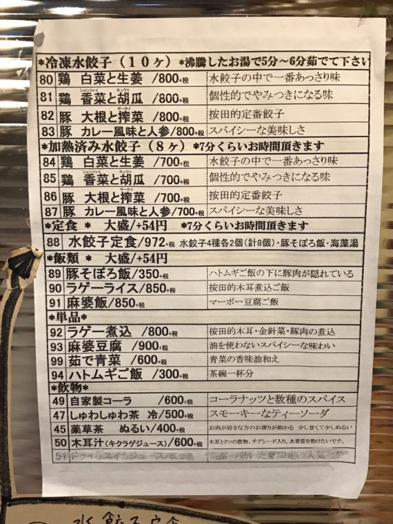2017.04.01 夜 女性をとりこにする水餃子とは!?@按田餃子 代々木上原店 餃子 新宿・代々木・大久保 〜999円 ★★★☆☆ 餃子をなめてはいけません!正直いいます。餃子屋さんの待ち時間なんてたかが知れてるとなめてました。代々木上原にある『按田餃子』でのこと。前三人の待ちだったのだが、店に入るまでに優に30分を超える待ち時間。外からは女性客が多さとお酒と楽しんでる雰囲気がみてとれます。 『按田餃子』は料理研究家の按田優子さんのはじめたお店。よく見ると漢字が一文字違うだけですね。按田優子さんは書籍も何冊もある著名な料理研究家なんですって。その中に「冷蔵庫いらずのレシピ」という本があるそうですが、こちらの餃子にもそのエッセンスを感じます。 塩漬けされた野菜が中心の水餃子なんです。もちろん冷蔵庫がいらないというメリットもあるだろうが、これが野菜の強い味につながっております。野菜は一種類ではなく、色んな野菜を使った水餃子を楽しませてくれます。全部食べたい!というわがままな方には「水餃子定食」がおすすめです。 4種類のライナップはこんな感じ。 鶏 白菜 生姜鶏 香菜 胡瓜豚 大根 搾菜豚 カレー風味 人参 全てが同じ皿に並べられるので、ロシアンルーレット状態。共通点は健康の味。皮なんかもハトムギ皮を使ってるそうなんですよね。このもちもちの皮の中の野菜からももちろん健康的な印象を受けます。 若干皮の存在感のほうが強い印象があるが、卓上の調味料がこれを一瞬で解決してくれます。ビシッと辛い自家製のラー油や「味の要」というカレースパイスがコクが感じられ餃子を1つ上のステージに引き上げます。 つい、味の要は瓶で買って帰ってしまいました。ちなみに、定食のご飯もハトムギご飯です。健康ワードが目白押しですね。 調子に乗ってもう1つ「ラゲーライス」を注文。誤植じゃないですよ、ラグーライスをもじった料理は正真正銘ラゲーライス。キクラゲを使った料理のようです。 キクラゲって他のキノコに比べてカルシウム、鉄、食物繊維などが豊富なんですって。他の具材となる豚肉もこれまた薬効のある八角で柔らかく煮ているのだそうです。ただのダジャレじゃなく、健康のコンセプトは忘れてないようです。 なるほど女性達がとりこになるわけだ。そして、彼女達が話に花を咲かせれば待ち時間が長くなるというものです。按田餃子をなめてはいけません! — 按田餃子 代々木上原店03-6407-8813東京都渋谷区西原3-21-2 1Fhttps://tabelog.com/tokyo/A1318/A131811/13140146/