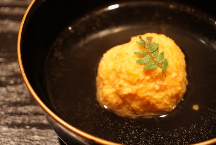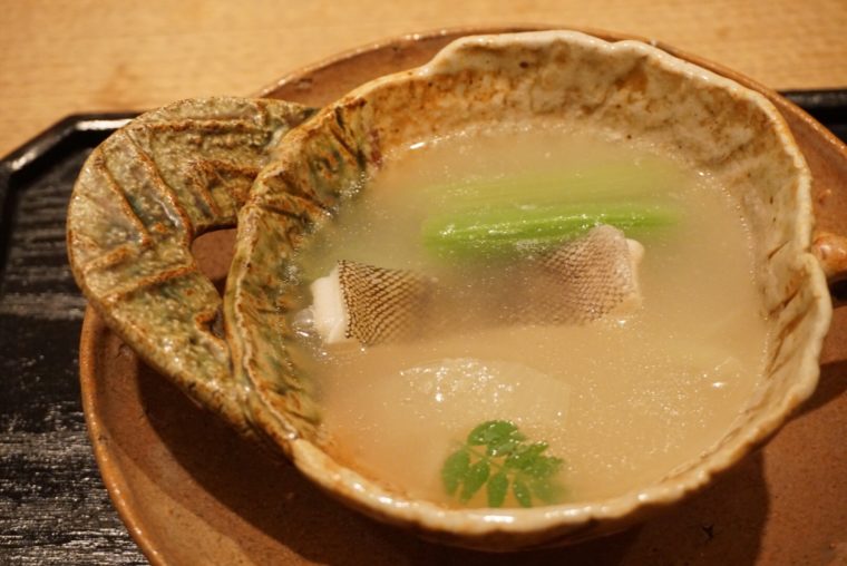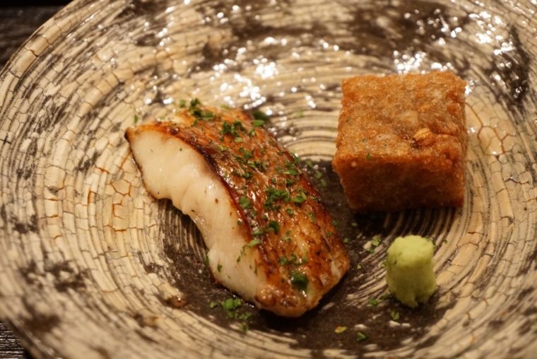 そして、焼物。これは「のど黒の西京漬け」西京漬けはそんなに長い時間漬けないんだとか。魚の旨味がきっちり残すためですね。にもかかわらず、味噌の風味がかなり鋭角に感じます。のど黒本来の脂の旨味を楽しみつつ、西京焼きらしい香りも楽しめる一品。