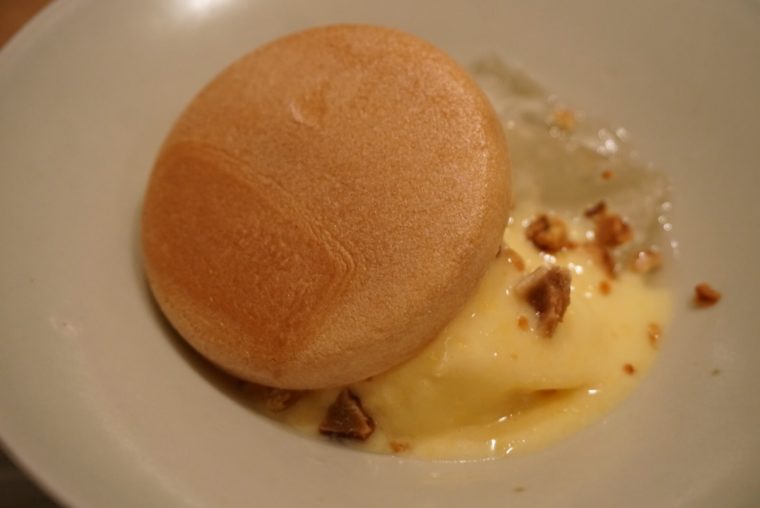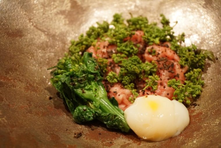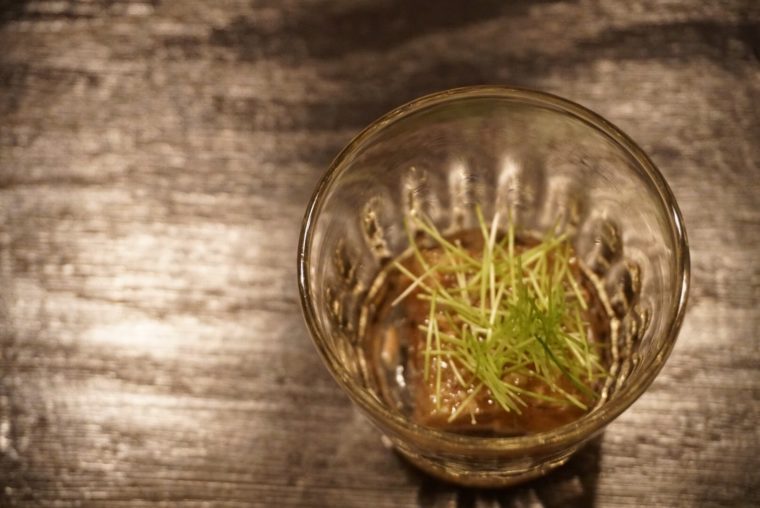 和牛と花山椒、ここまでは特に驚きはない。ここに鶉の卵の温泉玉子を合わせるのが憎い演出。玉子の濃厚なコクが牛との相性がいいことは説明するまではないが、後から追いかけてくる花山椒の風味とも抜群の相性を発揮します。花山椒の香りの余韻がたまりません!