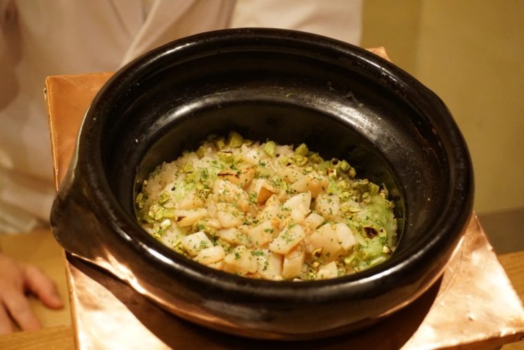 蒸し米の上に旨味がたっぷりの生の蛍烏賊。味付けの隠し味として、鰹出汁に加えて鰹の酒盗も使っているそうだ。これは旨いに決まってます。さらに塩気の役割として大胆に雲丹までのせられる。香りのいい有明の海苔の中で様々な食材が一体化しております。