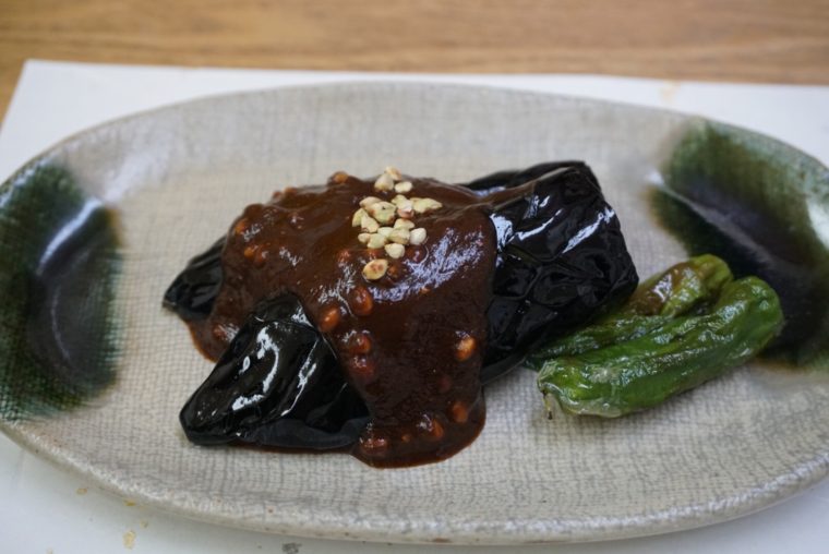 「なすのそばみそ掛け」茄子揚げ。甘辛い味噌に蕎麦の実。
