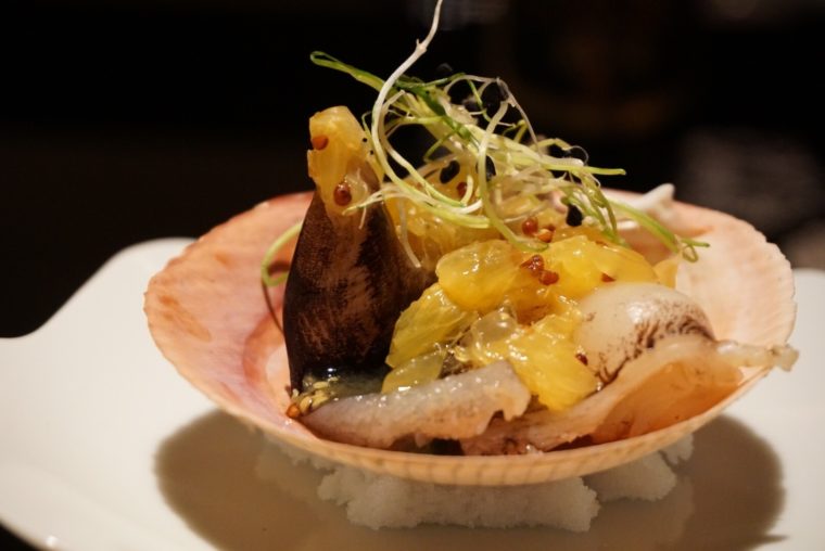 片面だけを炙ったトリ貝に合わせるのはソースが面白い。香りもいい玉ねぎの風味などまでは想像できるが、なんとここに柑橘とマスタードを合わせてきます。初っ端からバラバラな味覚を提案しつつ、一体感のある料理が完成しています。