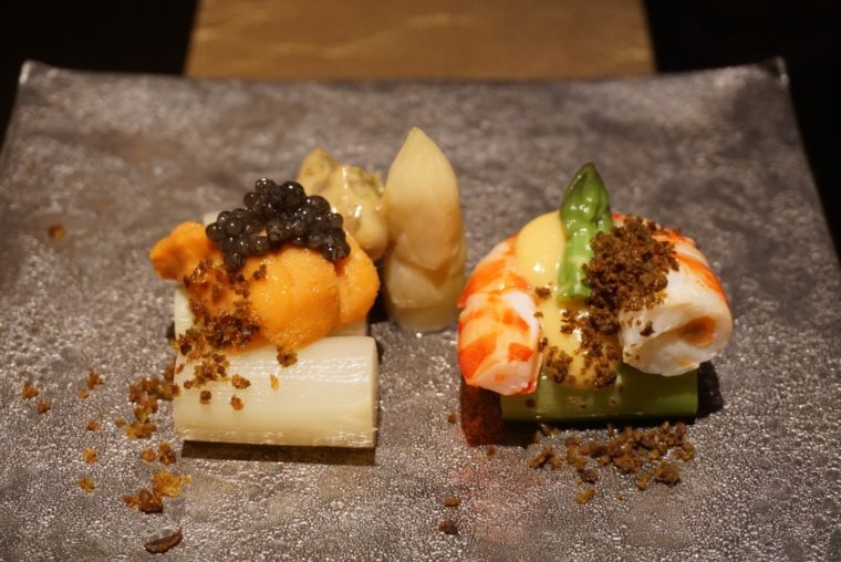 「アスパラガス」では雲丹、キャビア、車海老などの高級食材をふんだんに使いつつ、土台は季節の山菜が支える。蕗の薹の味噌、蕗の薹をくだいたもの、タラの芽を揚げたものなどだ。「洋」が原産の食材と「和」が原産の食材が見事にまでマッチし、それぞれの繊細な味を舌に届けてくれます。