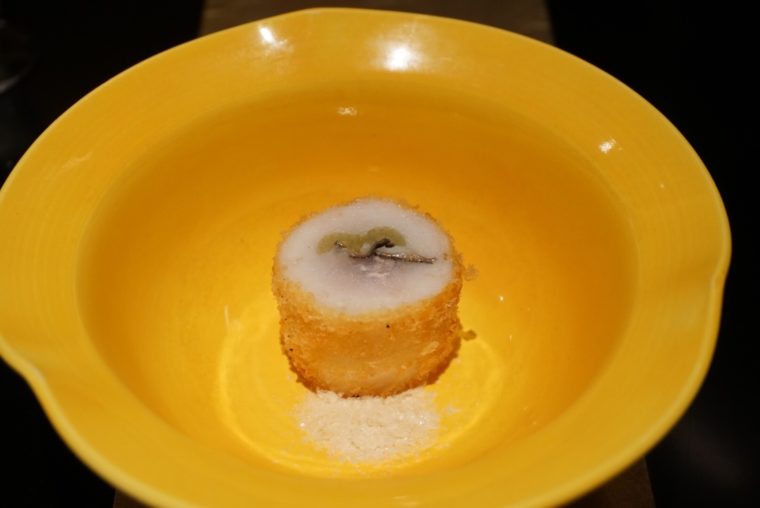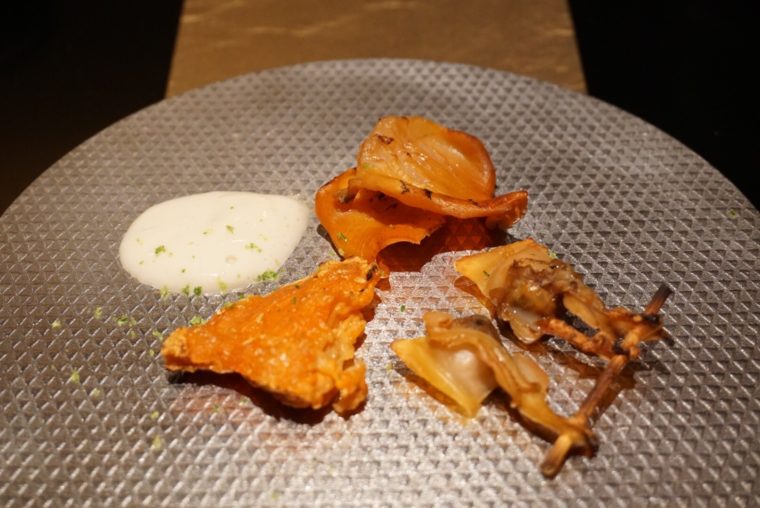 個人的にはこれに驚きました。地の「赤貝」「くちこ(青森)」「あさり(三河)」の乾き物。通常は日本酒のアテとして通りすぎていくものだが、つい立ち止まってしまいました。河豚の白子のソース を使う贅沢さはもちろんなのだが、その食感に驚くを隠せず。乾燥してるのに中身がしっとりしているというおよそ不可能な仕上がりなのだ。大将は表面だけを乾燥させると簡単に言うが、誰もができることでない。