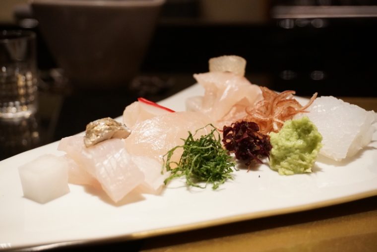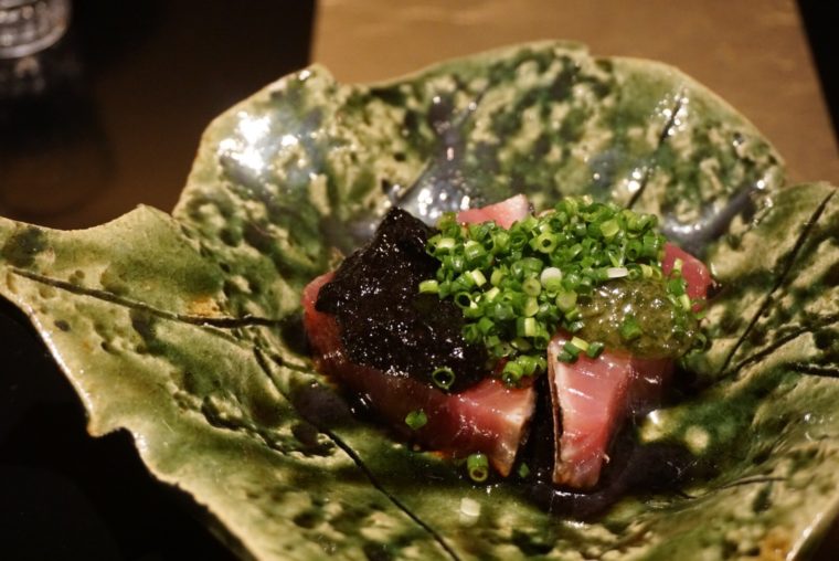 この対比は続く。「鰹」には焼き海苔のポン酢と紫蘇、梅、オリーブオイル、魚醤を使ったソースが合わせられる。これが驚くほど美味いのだから恐れ入る。一方で魚をねかせるという伝統的な技術をもって刺身(アイナメ、アオリイカ、ひらまさ、太刀魚)の旨味が引き出されます。
