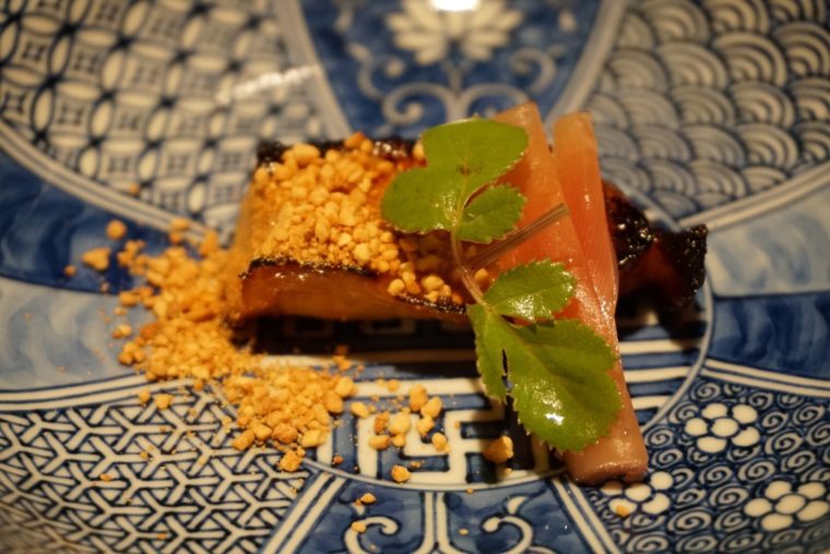 個人的な後半のクライマックスは「金目鯛(千葉)」。これが幽庵焼きであり西京焼きでもあるのだ。味を重ねていく天才かと思いきや、調理法まで重ねてきました。この絶妙な味付けにあわせるのがカシューナッツというのも斬新。勝手ながら野嵯和料理を知るのに象徴的な料理という印象を受けました。