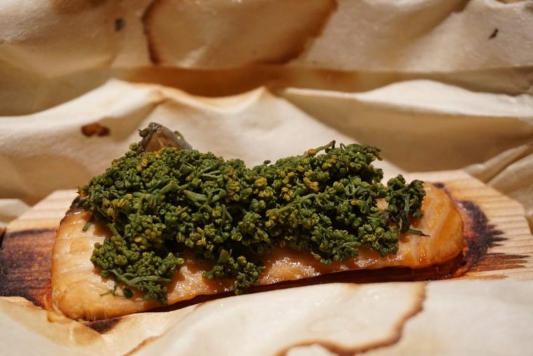 「本鱒の蒸し焼き」包み紙を開けば花山椒の香り。漬け込んだものを蒸してるので味の浸透度が高い。