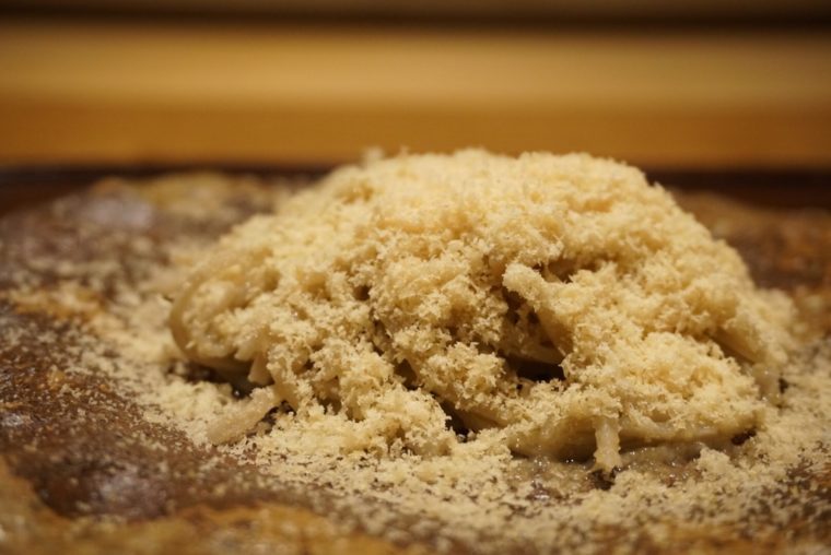 修業先のエッセンスとはこれ。和久傳で料理長も務めた「幸村」の名物としても有名な「カラスミ蕎麦」が登場。色味が薄いのが特徴的。逆に味は濃厚で、コシのある蕎麦にぴったり。ふわふわなカラスミは口の中で溶けていきます。