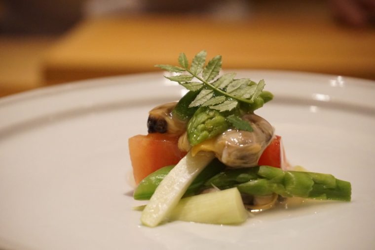 「アサリ アスパラガス トマト」涼しげな夏野菜の前菜。アサリの餡をまとわせて一体感を醸成。