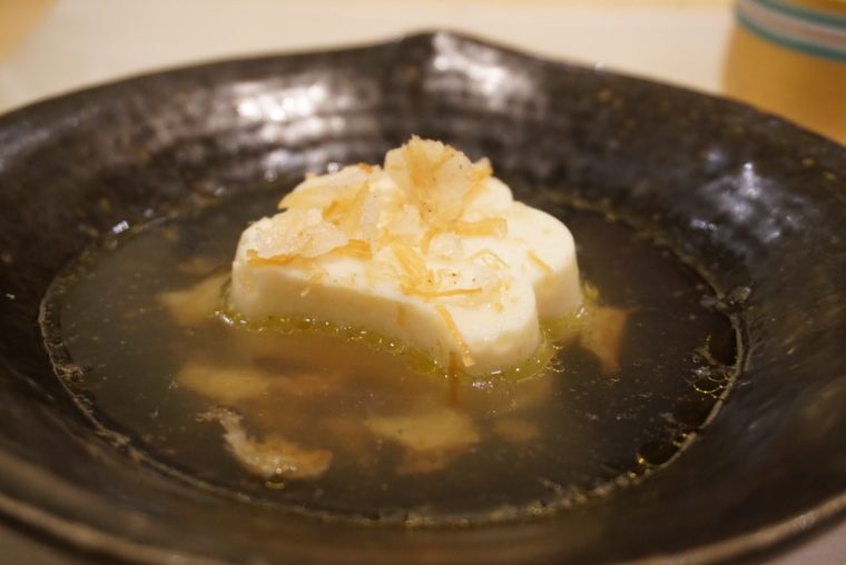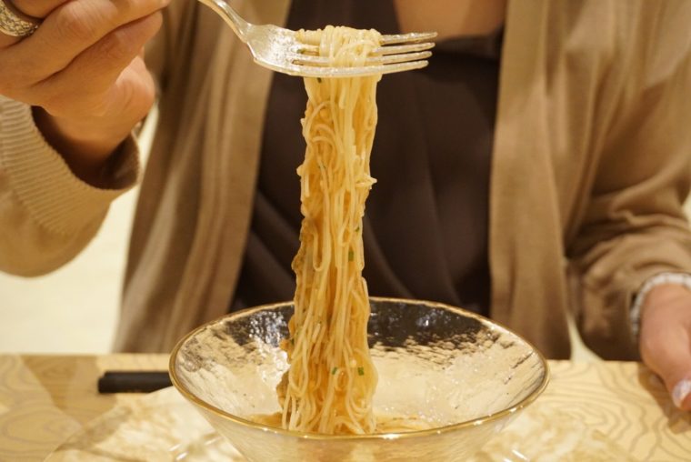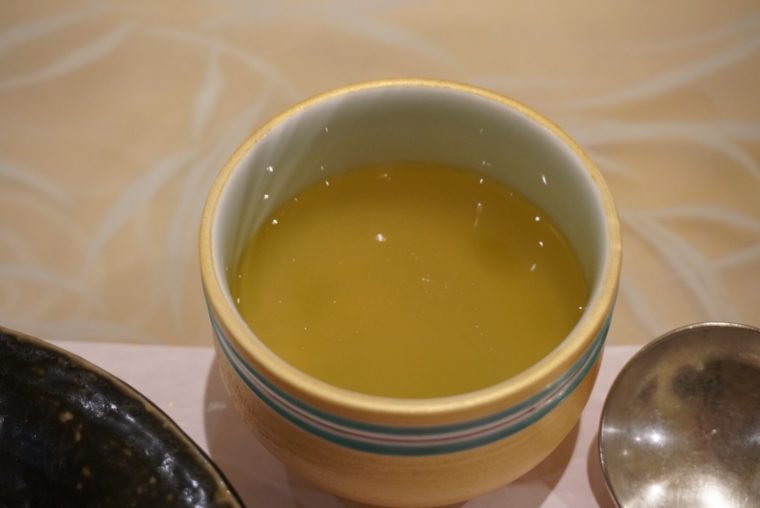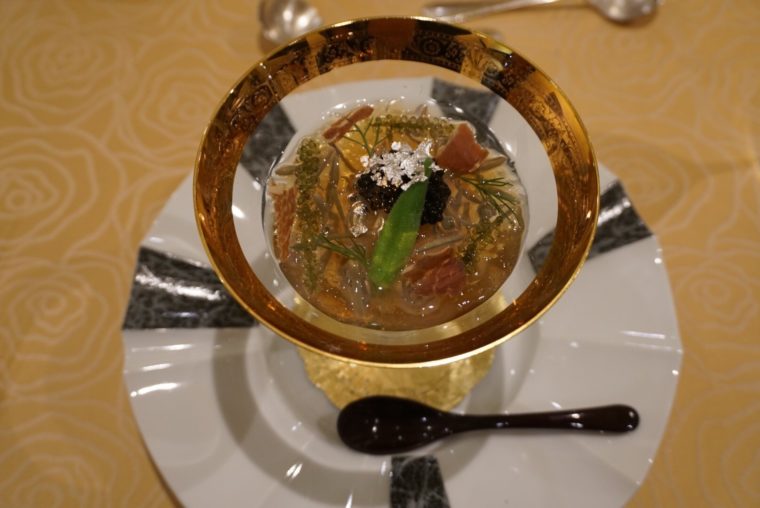 中華パンの中身はとろとろの宮崎牛のリブロースの角煮。サマートリュフとは思えないほど芳醇な香りが手の中におさまります。そしてお隣の名古屋コーチンとフカヒレのスープでは、ついに料理のカテゴリーを超えてきました。
