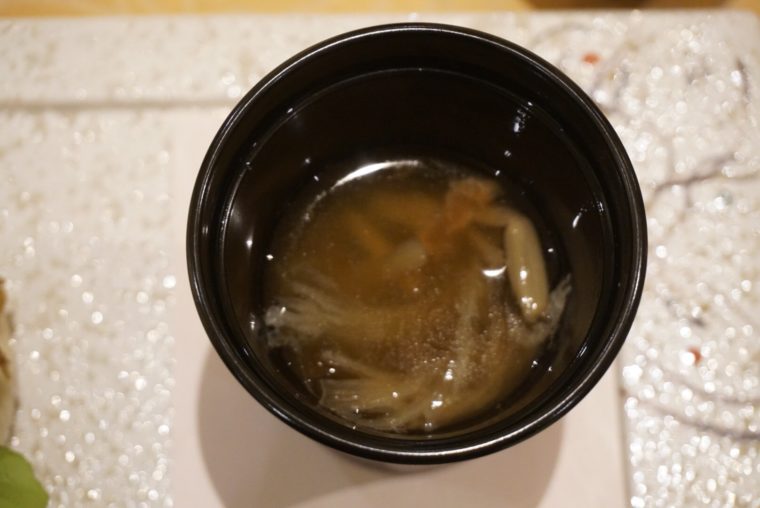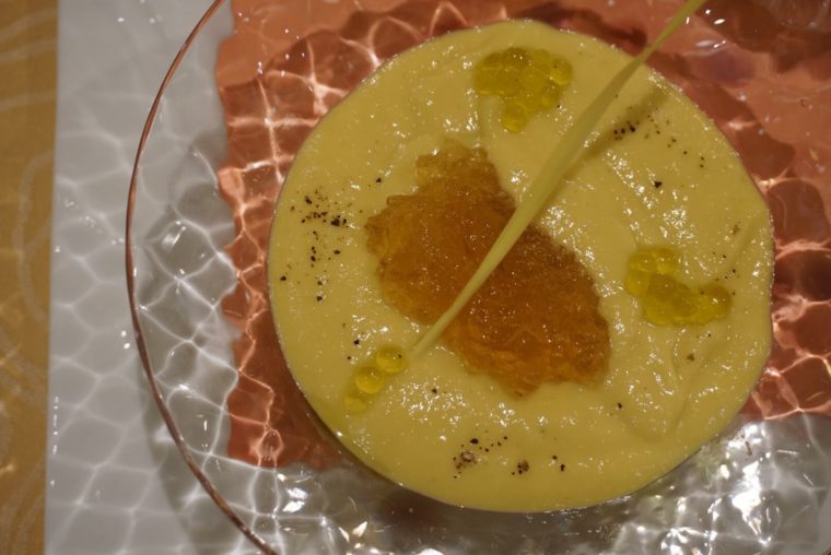 「味来の冷製スープ」では九州産のトウモロコシを様々な表情で提供してくます。生で一粒づつ煮詰めた自身の水分だけで作ったスープとポップコーンの形で提供。しかも脇を固めるメンバーがみんな主役クラス。スープにはダブルコンソメや白トリュフオイル。さらにはフォアグラのパウダーなんかもついてきます。