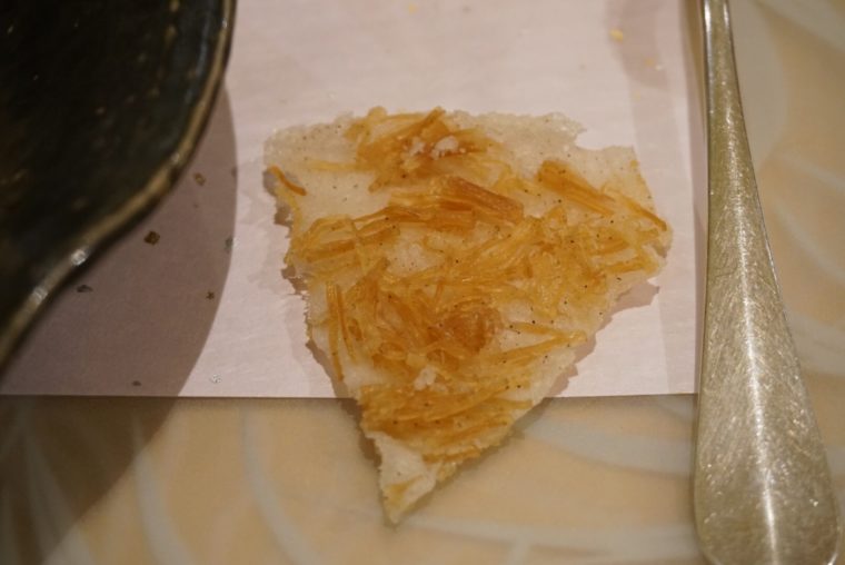 さてさて、だんだんおかしくなってきましたね。今度は数式が崩れ去ります。須本さんの料理は、1+1+1=10にしてきます。青森の陸奥湾の帆立のクリームに、干し貝柱のスープをかけて、帆立せんべいとともにいただきます。