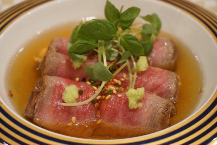 オイルバスで1時間半、低温調理で油浴された芯だけを使った平戸牛のサーロイン。ひとっ風呂浴びた後は、自身で作ったビーフコンソメに浸されます。包まれた馬糞雲丹はさながらサーロインのソースってことですね。雲丹と牛肉のマリアージュは珍しいものではないが、やはり工数に違いがみられます。