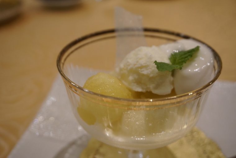 お、これは再構築系ですね。あのバブル時代を彷彿とするメロンにブランデーぶっこむやつです。ここでは、最高級のメロンのスムージーとブランデーの泡ですけどね。ある意味バブル時代を超えた贅沢ってことです。バブルを一切味わえなかった世代だが、追いついた気分です。いや、追い越した気分です。