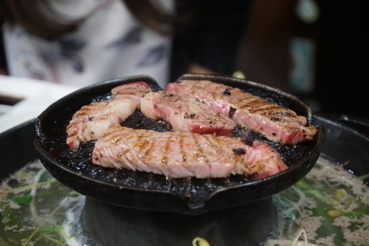 2017.06.12 夜 焼肉としゃぶしゃぶが同時にできる!?@かがやき 焼肉・肉料理 千住・綾瀬・葛飾 5000円〜9999円 ★★☆☆☆ 焼肉としゃぶしゃぶが同時にできる?そんな馬鹿な!なんて思った皆さん、ありましたよ。なんと三ノ輪に!予約困難店にも数えられる人気の肉料理の店『かがやき』にあったんです! これがその鍋!ずどーん! 上には焼肉スペース、下には湯気が立ち込める鍋が配置してます。これが地獄ならかなりつらい空間ですね。焼き地獄から落ちたら、茹で地獄みたいな。そして、この鍋が優秀なのは、焼きスペースの肉汁が鍋に滴り落ちるところ。肉の旨味を一切無駄にしない心意気の鍋でございます。 そして、「かがやき」の魅力は食べ放題にあります。しかも飲み放題も含めて5000円ぽっきりなんでです。この鍋を駆使して、好きなだけ好きなように肉を楽しめちゃうってわけです。さっきから肉の話ばっかりしてますが、野菜やキノコなんかも充実してますよ。 この肉はしゃぶる?焼く?なんて相談してたのも序盤だけ。 食べ放題をいいことに好きな食べ方で各々チャレンジしていきます。タンしゃぶにタン塩、短角牛のヒレやらロース、牛しゃぶに豚しゃぶ、ステーキにラーメンまで! めくるめく肉の楽園をご賞味あれ。肉の切り方や盛り方が豪快なんで、流行のインスタグラマー達にも魅力的ですよ! — かがやき050-5456-5910東京都台東区竜泉2-16-6https://tabelog.com/tokyo/A1324/A132401/13083284/