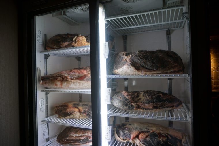 いったい何を提供してくる店なのでしょうか?勘のいい人はわかるかもしれないですね。店名になっているのは牛肉の部位であるランプ肉のこと。扉を開けた直後に目に飛び込んでくるのはまばゆばかりの肉達です。ではステーキ屋なのか?シェフに聞くと「銀座らんぷ」はイノベーションフュージョンだという。確かに後ほど紹介していく料理達は、フレンチを基礎としたクリエイティブな作品達だ。