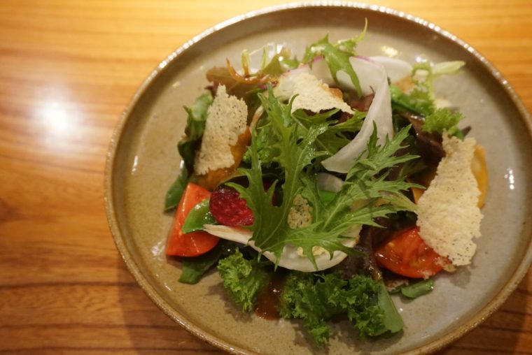 例えば、サラダでは1つ1つが際立つ味覚が提供される。熊本の塩トマトは極上の甘さを、からし菜は際立った辛味を感じさせます。野菜同士がそれぞれに影響を与え合う調味料とさえなっているのです。