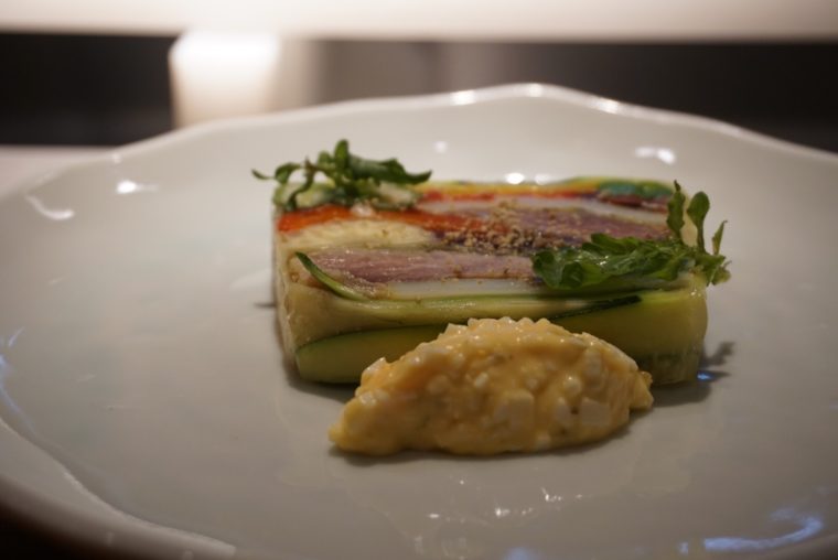 そして、銀座らんぷのスペシャリテである「野菜のテリーヌ」。15種類もの野菜がただ重ねられるだけでなく、旨味の層になって味わうことができます。野菜それぞれに違う調理を施し、それぞれのベストを重ねてるのだそう。アクセントに鮪の頬肉のコンフィも挟み込むが、野菜は決して主役を譲りません。