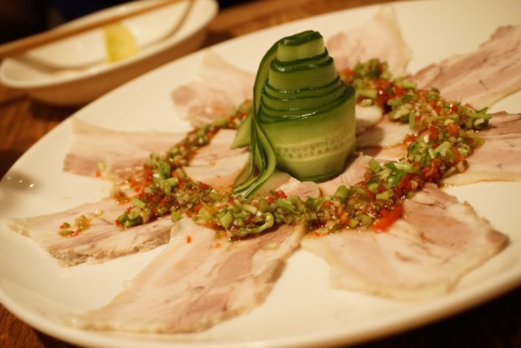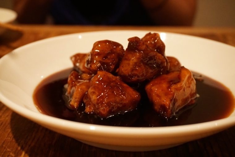 2017.08.02 夜 絶品の黒酢の酢豚×揚げ蒸しパン@Coolie’s Creek 中華料理 目黒・白金・五反田 5000円〜9999円 ★★★★☆ 白金にある中華料理店『Coolie’s Creek』ネオンが示す店名に白い壁、そして窓からのぞく広々した店内が中華料理を想像させません。どちらかというアメリカンな雰囲気ですね。英語だし(短絡的ですいません)。 四川料理が基本だが、エスニックのニュアンスも取り入れている模様。創作的なニュアンスがあるが、不自然さはない。もっとも中国と東南アジアも陸続きなのでニュアンスが混在することに違和感はないですね。 それを最も感じたのは「茹で豚のパクチーソース」。ベースになるのは四川料理の「雲白肉」だろう。ばら肉の薄切りに胡瓜のビジュアルは瓜二つだ。だが、中国系の調味料ではなく、パクチーで提供しているのがユニーク。豚の脂が重たくなりがちだが、十分に手助けしてくれます。 てな感じなので、メニューには中華と東南アジアが混在するので、優柔不断にはつらいところ。 そんな人には「前菜五種盛り合わせ」がおススメ。鶏レバーの紹興酒蒸し、台湾ピータン、蛸と胡瓜の和え物、焼豚とあるが、中でもお気に入りは「ザーサイの浅漬け」。漬物と侮ることなかれ。太白胡麻油が香る素晴らしいつまみです。それ以外も総じて手間隙かけて丁寧に作られているのが伝わります。 最後に紹介するのが必須メニューの「黒酢の酢豚」。シンプルすぎるほどシンプルな酢豚で、飴色の黒酢ソースが光に反射して見た目に美しい。豚バラの持つ脂のジューシーさは損なわれることのない仕上げ。他で食べる多くの酢豚は酸味が強すぎる印象を持つが、味と酸味のバランスのが絶妙だ。 これならご飯がいくらでもいける!と思うでしょうが、ちょっとお待ちください。この酢豚に合わせるのは「揚げ蒸しパン」でなくてはいけません。 外はカリッと中はふんわりの揚げ蒸しパン自体で成立しているのだが、是非酢豚と合わせてみてください。はっきりした酢豚の酸味と甘味がパンの油とやけに合うのです。 — Coolie’s Creek東京都港区白金1-2-6https://tabelog.com/tokyo/A1316/A131602/13091032/