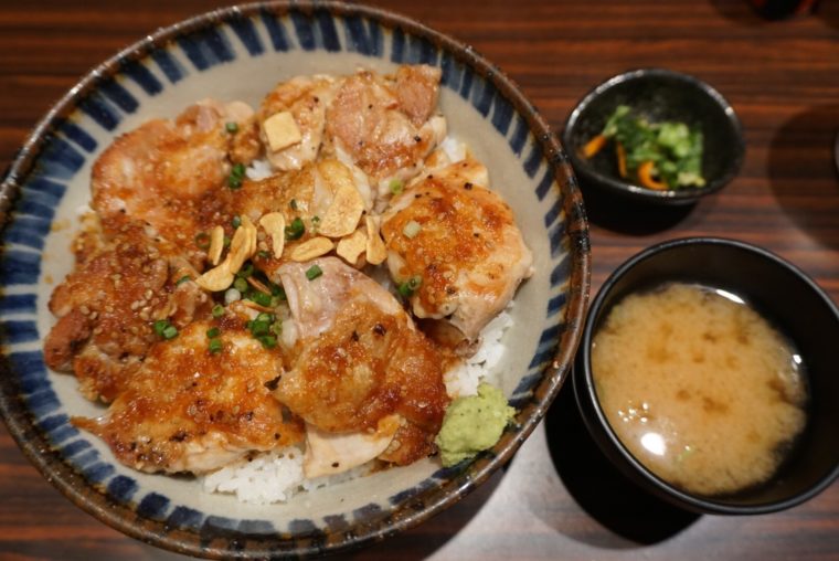 さて、男ミトミえもんはもちろん肉料理にロックオン。パリッとジューシーと宣伝する「チキンステーキ丼」の大盛りをいただきます。ボリュームについては文句のつけようがありません。チキンは厚みもあり、器を埋め尽くします。味は完全にニンニクに支えられてます。