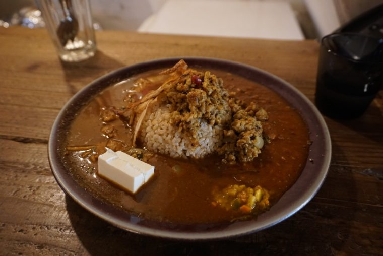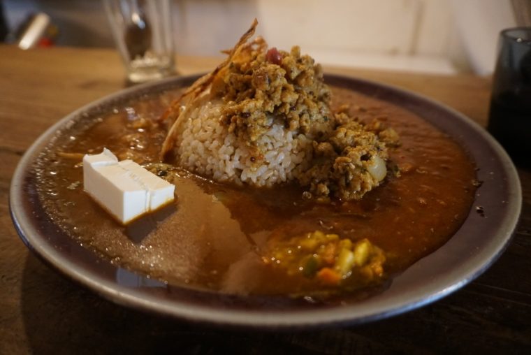 2017.09.30 昼 大阪スパイスカレーは面白い!人気店「SOMA」は薬膳のニュアンス!?@SOMA カレー 大阪市 1000円〜2999円 ★★★★☆ カレー先進国の大阪にあってトップクラスの人気を誇る『SOMA』。大阪の北区中津の住宅地に溶け込んだカレー店。古民家風のお店で、行列なしにはなかなかカレー屋だと認識しづらい。ちなみに、気合を入れての40分前の訪問だったがそれでも3番目。いかに人気があるかがビンビンに伝わってきます。 さて、大阪ではスパイスカレー全盛だが、この定義ってもの凄く難しいですよね。そもそもスパイスの種類なんて何千とあるのだから、味が違うのは当たり前って話です。 強いていうなら、ルールはスパイスを駆使してワンプレートで提供することくらいじゃないでしょうか。そのぶん、1つとして同じカレー店がなく、この自由度が大阪カレーを盛り上げてる最大の理由でしょう。だからこそ、大阪のカレー巡りがやめられません! さて、SOMAのカレーはどんなユニークさを持っているのでしょうか。注文したのは「チキンキーマ+トマトカレー+お肉のカレー(豚バラ)」にチーズトッピングをさせていただきした。辛さは6倍以上の設定が可能だそうだが、初訪問なのでデフォルトでいただいてみましょう。普通のカレー店の中辛くらいの辛さだそうです。 第一印象は「薬膳」のようなニュアンス。ただ、地味なスパイス使いではなく、華やかというか爽やかなスパイス使いの印象です。粗挽きのキーマが目にも舌にもインパクトが強いですね。もしからたら、お米が白米ではなく、玄米であることが薬膳を強調したのかも。薬膳系が好きな人にはたまらないカレーだと思います!スープ状になったトマトカレーは酸味が強い。口の中でザクザクするほどスパイス感を効かせてます。 ワンプレートの提供らしく、スプーンのすくい方で様々な味の変化を楽しめます。アチャールや玉ねぎの素揚げ、トッピングしたチーズなどもしっかり働いてくれました。 — SOMA06-7503-8217大阪府大阪市北区中津3-18-2https://tabelog.com/osaka/A2701/A270101/27065233/