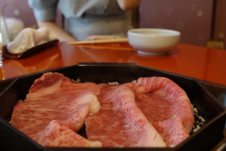 2017.10.01 昼 京都が誇る老舗の1つ。すき焼きの三嶋亭!@三嶋亭 本店 焼肉・肉料理 京都市 10000円〜29999円 ★★★★☆ 京都には100年以上続くお店がなんと千店以上!老舗という称号を獲得するには、最低限これくらいの歴史が必要なのでしょうね。さて、やってきたのは正真正銘の老舗である『三嶋亭 本店』。創業は堂々の明治6年(1873年)、5代目と継がれてきた老舗のすき焼き店です。入り口のガス燈なんかからは文明開化の香りも漂ってきます。アーケード街の中にあるが、きっとアーケードができる前からそこにあったのでしょう。 格式のある店の敷居をまたぐと下足番が待っていてくれる。最近はめっきり減りましたが、こういうことを大事にするところに老舗の矜持が伝わってきます。二階にあがった大広間で食事をいただくのが基本だが、思い切って一階の静かな個室を予約。個室料がかかるものの、いいお店では贅沢に行きたいものです。 注文したのは「月コース」のすき焼き。オイル焼き、水炊き、季節によってはみぞれ鍋などが選択肢になるが、初めての訪問であれば間違いなく看板料理のすき焼きを頼みましょう。そういえば、この種の高級すき焼きってジャンルの店は減りましたよね。そういう意味でも伝統として継続している三嶋亭には拍手を送りたいですね。 産地にこだわらず全国から選りすぐったという肉は「リブロース」と「ロース」。独自の方法で熟成保存したという結果なのか、脂がたっぷりなのに胃にもたれるようなことがありません。 調理は全て仲居さんが担当してくれるのだが、牛脂、牛肉と乗せた後に大量の砂糖をいれます。これは関西のすき焼きの特徴ですね。 最初から割下で煮るわけではないので、肉自体の旨味がダイレクトに伝わるような気がします。肉の旨味を砂糖がきっちり引き出します。関東でも関西でも溶き卵が一段上のレベルに連れて行ってくれることは共通です。 胃にもたれないのは、野菜を効果的に挟んでることもあるのでしょう。自分のペースだと肉だけバシバシやってしまいそうだが、仲居さんがコントロールしてくれるおかげですね。 肉や卵だけでもご飯がどんどん消費されますが、「牛肉のしぐれ煮」も人気の一品です。ついついお代わりが進んでしまいます。笑 — 三嶋亭 本店075-221-0003京都府京都市中京区寺町通三条下ル桜之町405https://tabelog.com/kyoto/A2601/A260201/26000646/