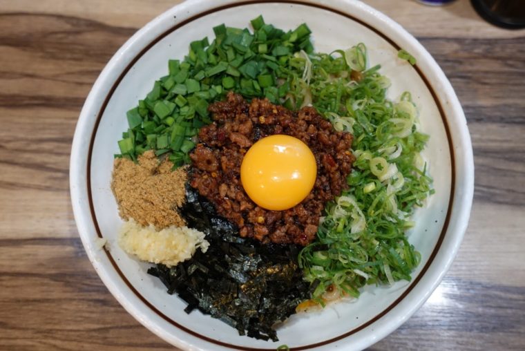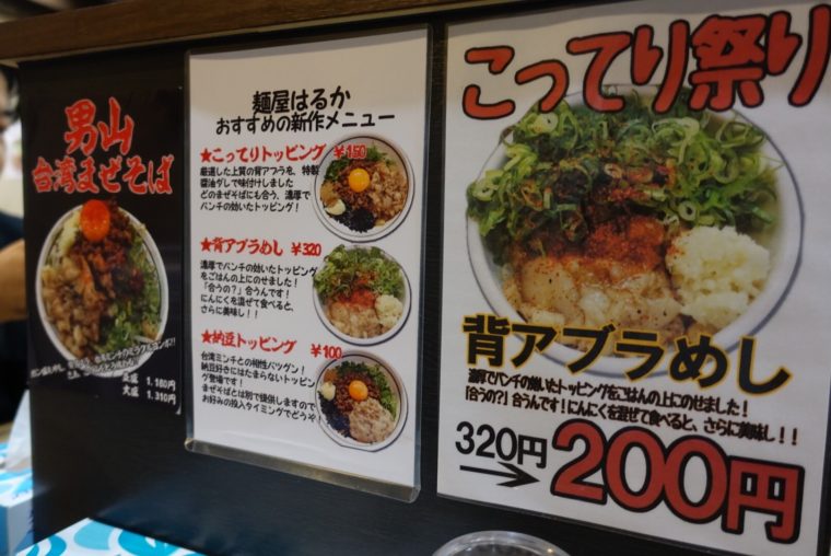 2017.10.12 夜 台湾まぜそばの元祖の姉妹店!@はるか 秋葉原店 ラーメン・つけめん 秋葉原・神田・水道橋 〜999円 ★★☆☆☆ 東京でも「台湾まぜそば」が着々と浸透してきましたね。この料理はご存知の通り名古屋生まれ。元祖は「麺屋はなび」という名古屋市の高畑という土地で生まれています。どうせなら発祥の味をいただきたいものですよね。そういう方々に朗報です!東京でも発祥の味を楽しむことができるんです。東京の新宿にある「麺屋はな び」に加えて、秋葉原には姉妹店である『はるか』という店も。本日は姉妹店のほうへお伺いしましたが、こちらライセンスチェーンのようですね。チェーンとはいえ、本店の遺伝子はきっちり残っているようです。店舗の中の貼り紙なんかからも伝わってきます。 メニューには、「男山」「こってり」「背脂」などとそんな言葉が並びます。学生には大盛り無料がのサービス提供をするなど、「麺屋はなび」と比べて量にたいするアプローチが強い印象です。台湾まぜそばってそーゆーんだっけ?笑 台湾ミンチというひき肉には、唐辛子とたっぷりのニンニクを効かせてます。少々発汗作用があるピリ辛で食欲がそそります。その他、ニラ、ネギ、魚粉、卵黄などが参加している。中でも海苔と鰹節の存在がいいアクセントになってます。 麺は粘り気があり、具材との絡みがいいです。もちもちの強い食感も強烈な味付けに負けぬ存在感を発揮します。昆布酢をいれてさっぱり方向に味変してみるのもあり。 まぜそばは追い飯をかましてなんぼ!という事で当然のようにご飯を投入。濃厚な味をご飯が全て吸収してくれます。この相性の良さは説明の必要がないですね。 — はるか 秋葉原店050-5571-6519東京都千代田区外神田3-13-7 田中無線電機ビルB1Fhttps://tabelog.com/tokyo/A1310/A131001/13176415/