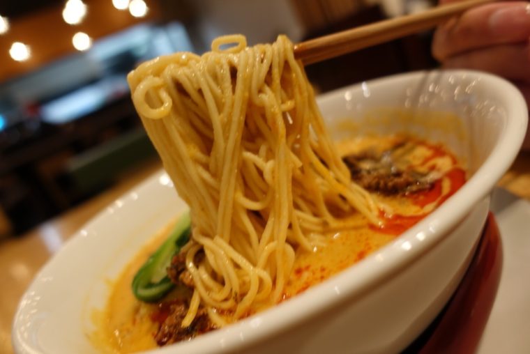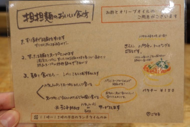 2017.10.16 夜 銀座に登場。女性狙いの担々麺専門店!!@ごまる ラーメン・つけめん 銀座・新橋・有楽町 〜999円 ★★★☆☆ 銀座一丁目にある担々麺専門店『ごまる』へ。東海地方を中心に展開する「ごまめ屋」というラーメンチェーンの東京進出店。数種類のラーメンを提供しているようだが、銀座のお店は担々麺に特化しての挑戦のようだ。 メニューだけでなく、ターゲットも女性に寄せて展開しているようです。モダンな雰囲気や美容などへの配慮がそれを伝えてくれます。女性客へは胡麻豆乳野菜ジュースのサービスなんかもあるようですよ!! さて、肝心の担々麺をいただいてみましょう。すり胡麻の形で提供されるので足すことはできるが、胡麻より辣油、辣油より花椒って感じの仕上がりです。そもそもオリジナルという辣油にも山椒を加えているそうなので当然の印象だ。花椒は突き抜けるような爽やかなスパイスで、柑橘類であることを再確認させてくれます。青山椒、赤山椒をブレンドしてるんですって。 全体的な辛さは結構強め。女性は辛いものへの耐久力も強いですからね。トッピングにパクチーが用意されていることも女性好きしそう。 最後はもちろん追い飯で〆ますが、バケットをスープに浸して食べる事もリコメンドしている。なんだかこれも女性的ですね。 — ごまる東京都中央区銀座1-14-5 銀座ウイングビルhttps://tabelog.com/tokyo/A1301/A130101/13192294/