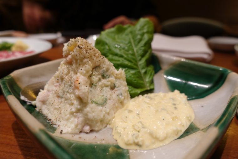 お通しから松茸のご飯が登場(さすが高級店)。季節の和風野菜サラダである「田中田サラダ」、タルタルソース付きの「ポテトサラダ」なんかをいただいた後は、さっそく肉料理をいただきます。