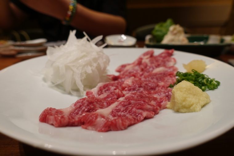今回の福岡ツアーは寿司中心だったので、肉が食えるのが嬉しい。歳をとって魚の方が好きになったと思ってきたが、やはり肉への欲望は避けられません。せっかくだから九州らしさを感じる肉を注文しましょう!まずは、熊本が誇る「馬刺し」。厚切りで脂もしっかりのっていて満足感が高い。