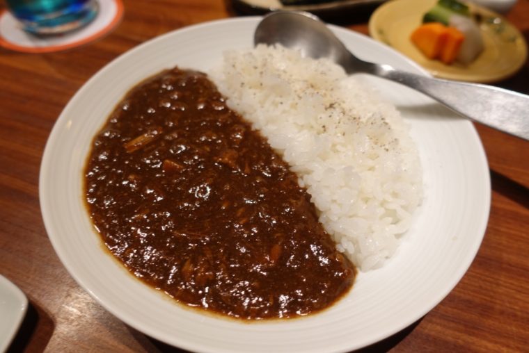 名物のビーフカレーはスパイスを適度にきかせた欧風カレー。ご飯に胡椒をかけてアクセントを作っております。サイズもいろいろ選べるので、お腹に合わせて注文してみてください。