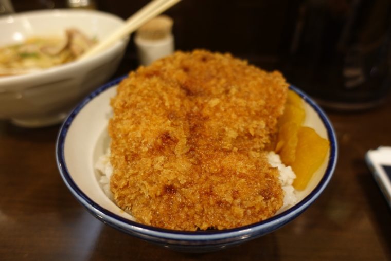 新潟のカツ丼であるタレカツにイメージが近いが、わらじのように大きく広がった豚カツが特徴のようです。わらじであれば2枚食べたいところですが、ラーメンも食べてるのが片足ぶんを注文。それでも丼からはみ出るほどの大きさです。わりとスッキリしたタレなので、なんとか完食できました。