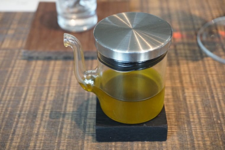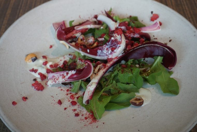 この高級野菜を使った料理が続きます。まずは「サラダ」にて素材が持つほのかな苦味を活用。ブルーチーズや蜂蜜ビネガーなど様々な味と組み合わせて味わい深いサラダを完成しています。