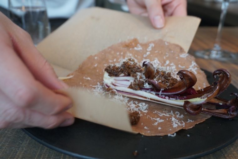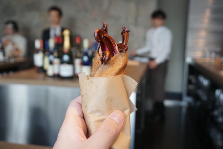 ユニークだったのが次に登場したの「クレープ」。タルティーボの他は、カレー風味のようなスパイスをまとった蝦夷鹿のラグーソースといただきます。散らしたチーズもいい働きをしていて、通常のクレープ生地を使うもレベルが数段違うものに仕上がってます。
